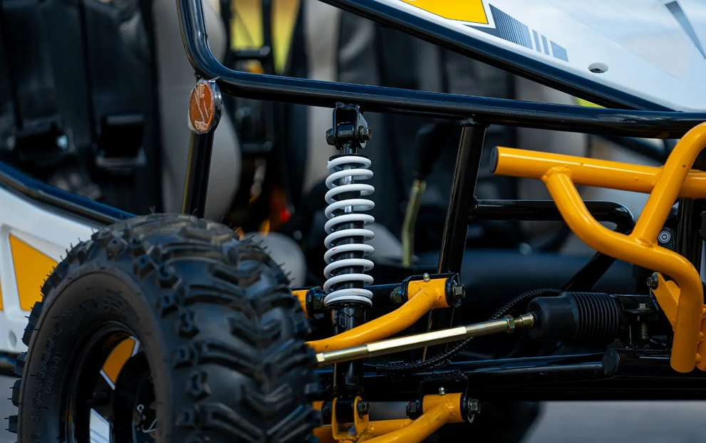 Na parte traseira, conta com Suspensão de Eixo Oscilante (Swingarm)). Já na suspensão dianteira, o KART 125 possui Double Wishbone