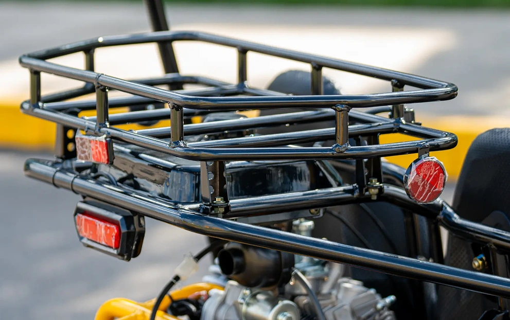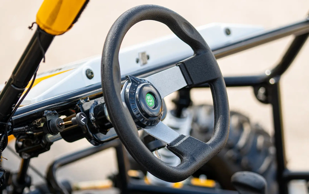As rodas do KART 125 são aro 8 e contam com o freio dianteiro e traseiro a disco hidráulico, proporcionando uma frenagem mais eficiente e rápida. Além disso, ele possui marcha ré.