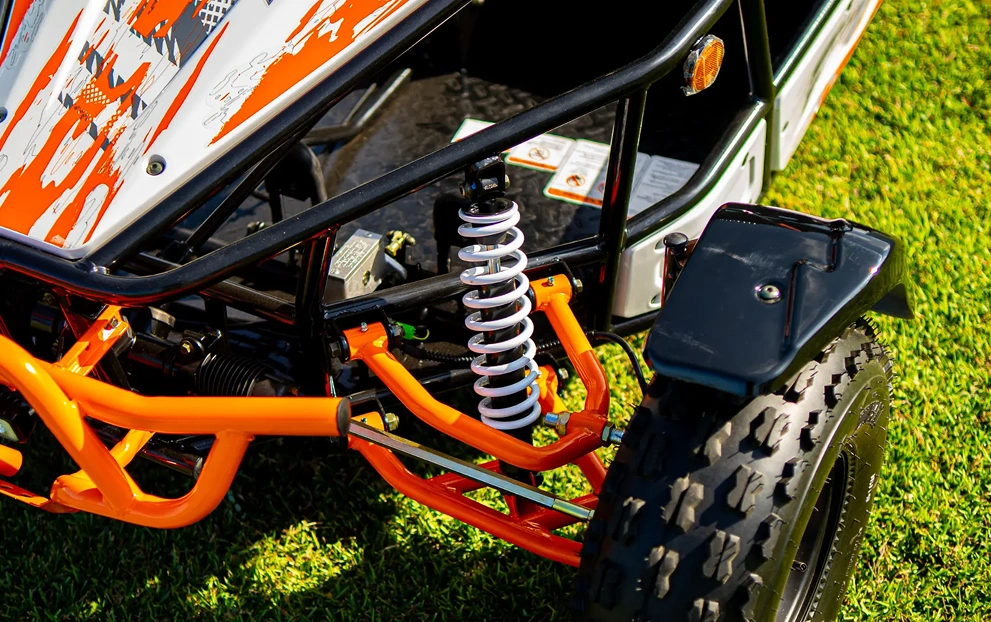 Na parte traseira, conta com Suspensão de Eixo Oscilante (Swingarm)). Já na suspensão dianteira, o KART 200s possui Double Wishbone.