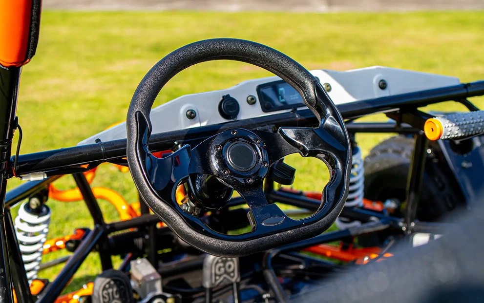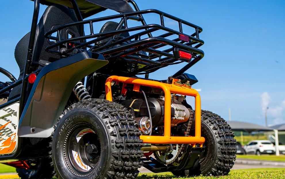 As rodas do KART 200s são aro 8 e contam com o freio dianteiro e traseiro a disco hidráulico, proporcionando uma frenagem mais eficiente e rápida. Além disso, ele possui marcha ré.