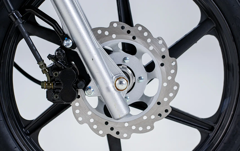 A RIO 125 EFI conta com rodas de liga leve garantindo mais estabilidade e aderência ao solo, na dianteira conta com aro 17´´ e aro 14´´ na traseira. Além disso, conta com o freio dianteiro a disco, oferecendo uma frenagem mais eficiente e rápida.